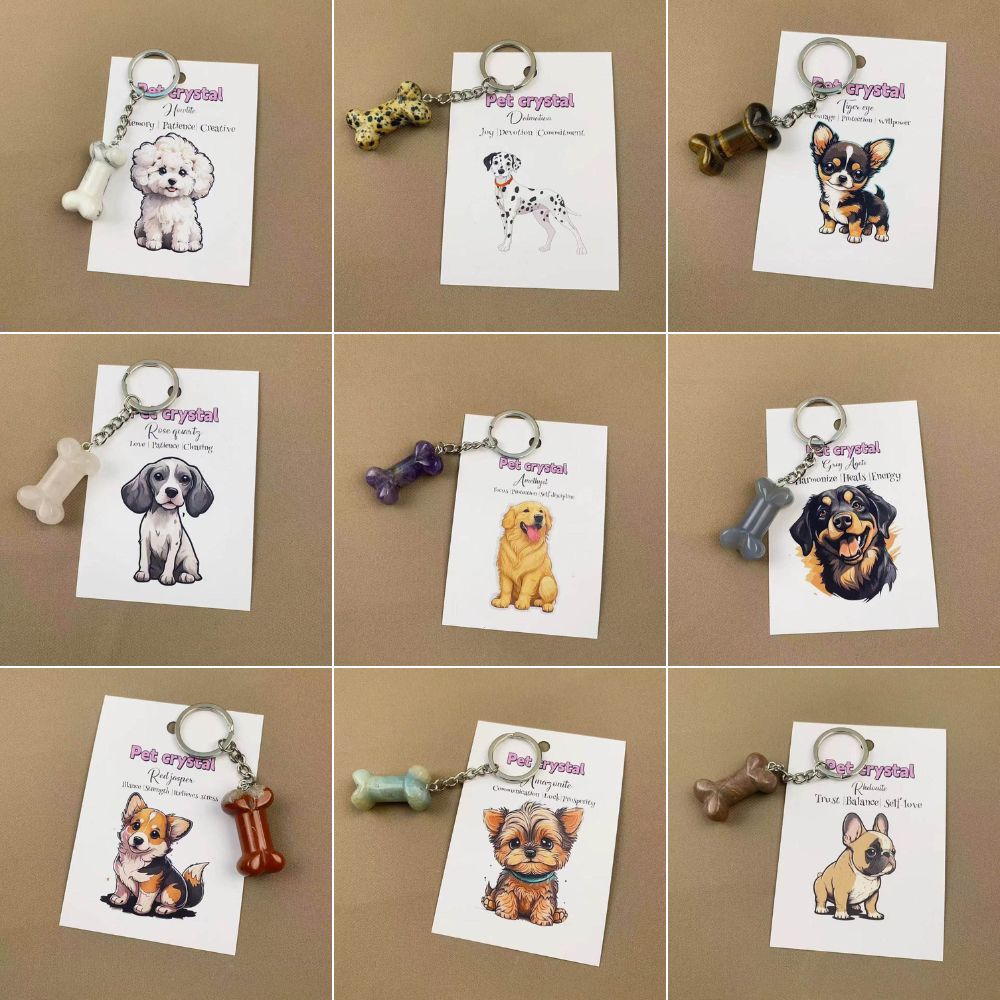 The Pet Crystal Keychain is a heartfelt keepsake designed to remind you that you’re never alone. Each set includes a shimmering crystal bone charm and a sweet illustrated card featuring an adorable pet breed of your choice.