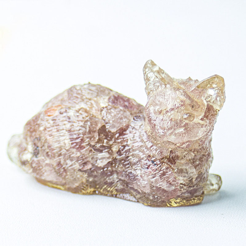 - 1 x Handmade Natural Crystal Gemstone Lying Cat - Strawberry Quartz