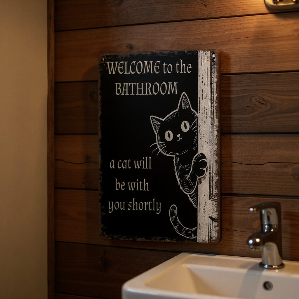 Transform your bathroom with this charming cat design! The "Welcome To The Bathroom" sign adds a whimsical, nostalgic vibe. It's crafted from durable aluminum, ensuring longevity.