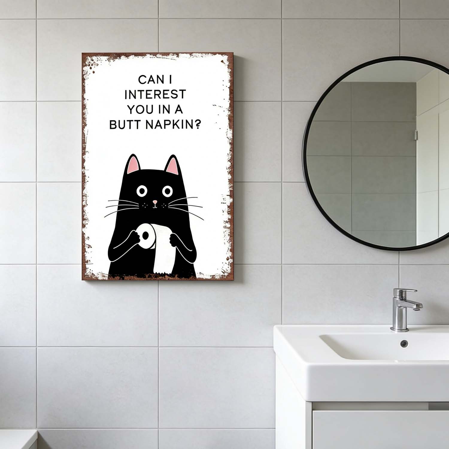 This funny black and white digital download features a cat holding a roll of toilet paper with the text that reads "CAN I INTEREST YOU IN A BUTT NAPKIN?" This print is ideal for those seeking unique animal bathroom art. Let our whimsical print create a bathroom that brings out joy and laughter. Perfect gift for cat lovers.