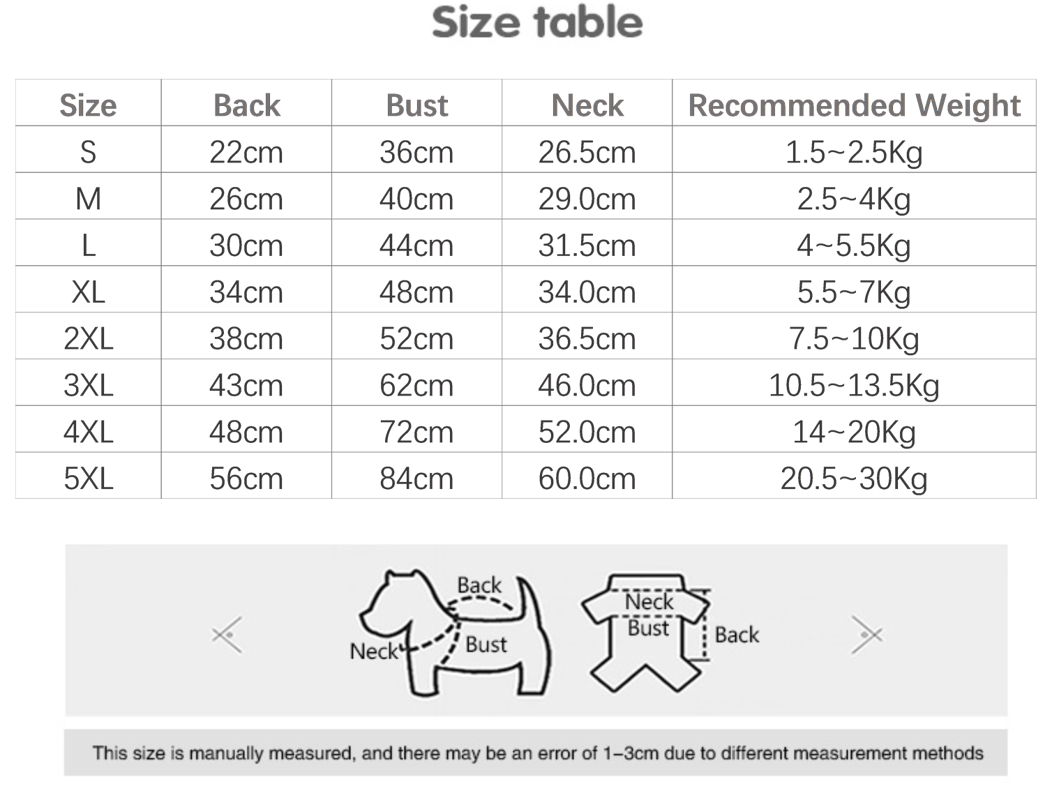 Manual measurement may result in a 1–3 cm variance.