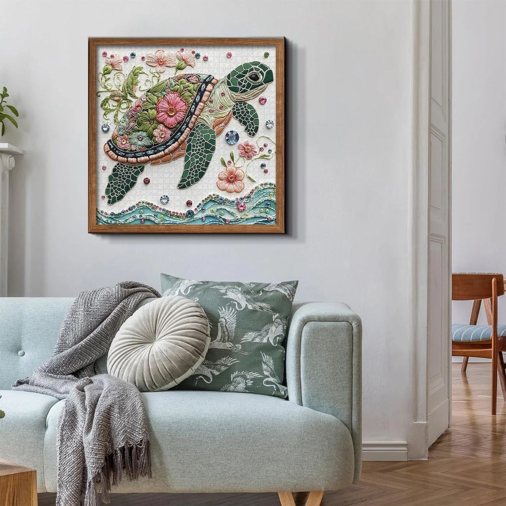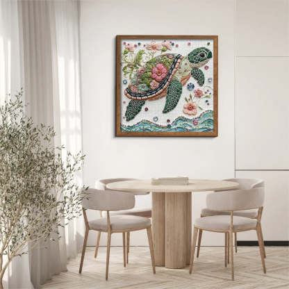 Intricate Floral and Wave Design: The sea turtle's shell is intricately adorned with floral motifs, blending delicate flowers with the flowing energy of waves. Each detail is meticulously crafted, from the soft curves of the waves to the intricate flower patterns, making every piece a vital part of the overall masterpiece.